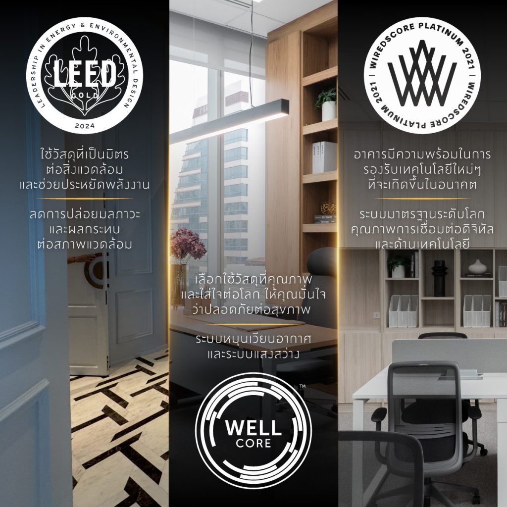 LEED Gold อาคารนี้จึงเป็นมากกว่าสถานที่ทำงาน แต่คือ รากฐานทางเทคโนโลยี ที่ช่วยให้ธุรกิจของคุณเดินหน้าอย่างมั่นใจพร้อมสะท้อนภาพลักษณ์องค์กรที่ใส่ใจความยั่งยืน และมีวิสัยทัศน์ที่ก้าวไกล